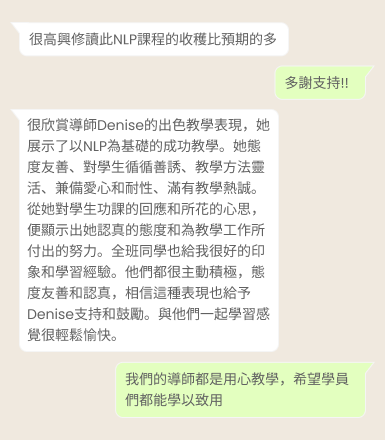 上課前,未接觸NLP時,都未能完全掌握究竟NLP 是什麼,上完NLP課堂後,可以掌握到NLP,透過NLP改善語言機制,完善滿足自我發展的正面需要,包括快樂,投入,積極及親和態度。運用NLP技巧除去負面情緒,抽離有關身心的負面思想,全面開展活潑快樂豐盛人生,功能上能快捷與意識及潛意識對話;視覺,聽覺,感覺,我們對每個感覺都可以調節及改變,將它形象化,將負担減輕,衷心多謝NLP導師-華博士!!